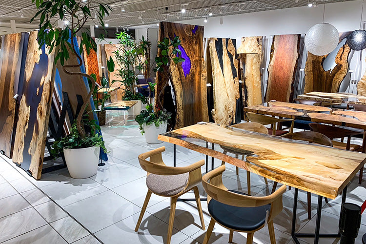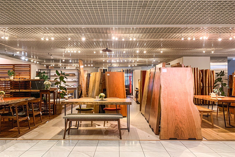 関東圏に限らず、国内の一枚板専門店の中で、随一の在庫数を誇るアトリエ木馬新宿ギャラリー。