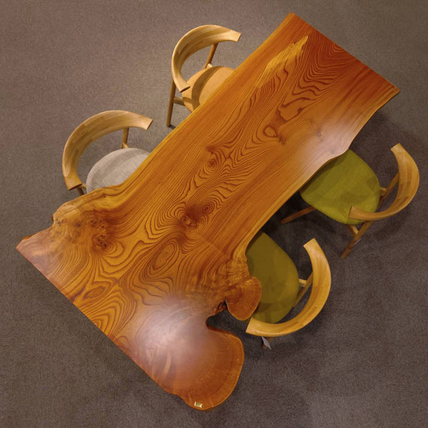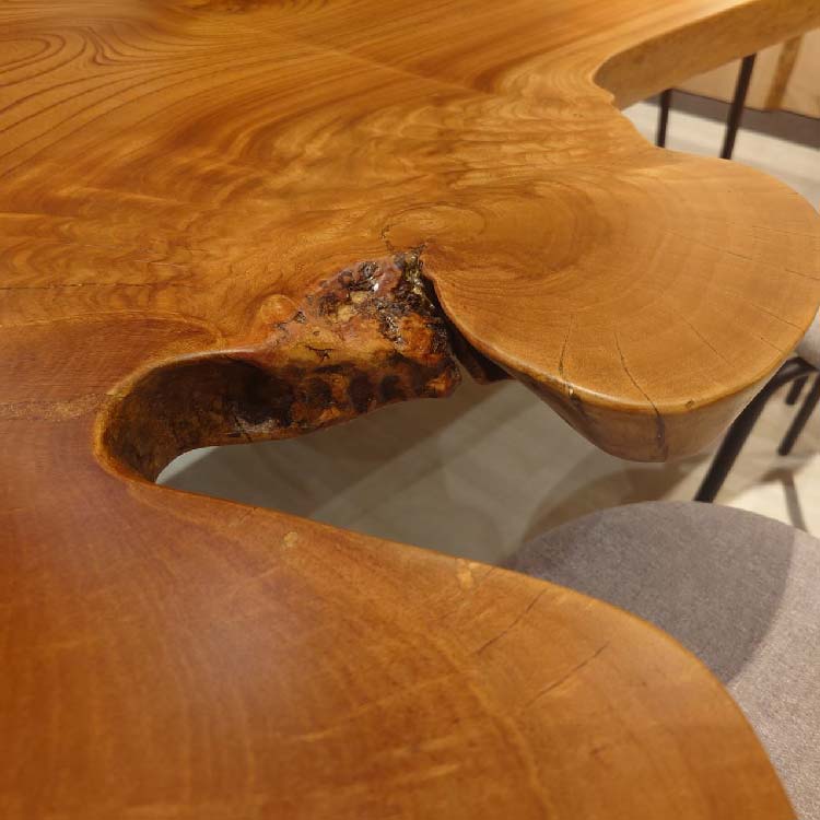 木には人と同じように個性があります。樹種や産地、樹齢はもちろん、同じ丸太から製材した一枚板でも同じものはひとつとしてありません。同じ名前の木でも色の明るいもの、暗いもの、節があるもの、傷があるものなど様々です。それは木が長い年月を過ごしてきた証であり、木が持つ個性です。だからこそ一枚板は‘世界にひとつのモノ’になるのです。