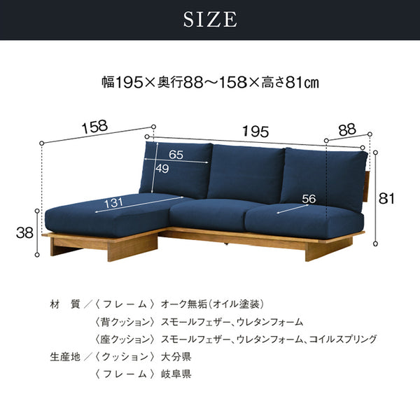 フレーム:幅200cm×奥行93cm×高さ66.5cm フレーム:幅70cm×奥行75cm×高さ43cm クッション:幅65cm×奥行15cm×高さ47cm ×3個 クッション:幅65cm×奥行76cm×高さ18cm ×2個 クッション:幅65cm×奥行146cm×高さ18cm |