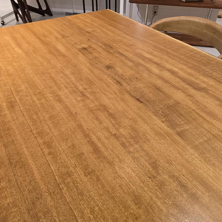 樹脂膜が水や汚れから木を保護してくれますので、日頃のお手入れは乾拭きや水拭きのみで済み、非常に楽にお使いいただける点が特徴です。特に飲食が主な用途になるダイニングテーブルでは、その効果を特に発揮します。