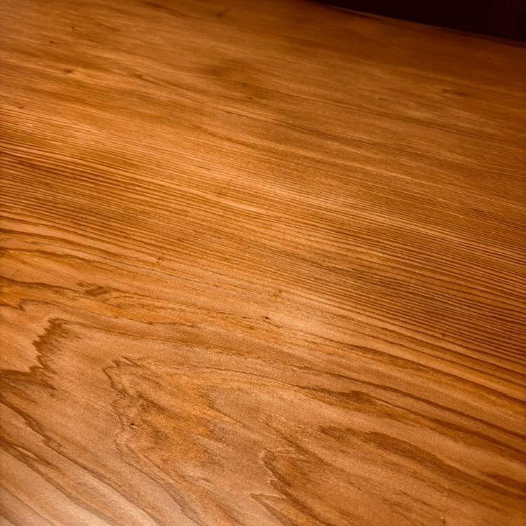 樹脂膜が水や汚れから木を保護してくれますので、日頃のお手入れは乾拭きや水拭きのみで済み、非常に楽にお使いいただける点が特徴です。特に飲食が主な用途になるダイニングテーブルでは、その効果を特に発揮します。