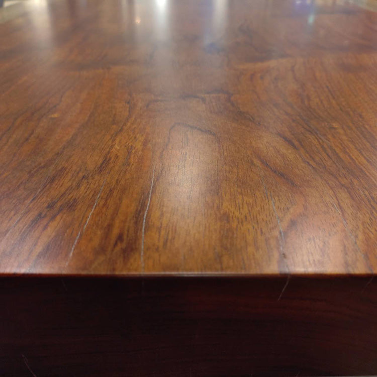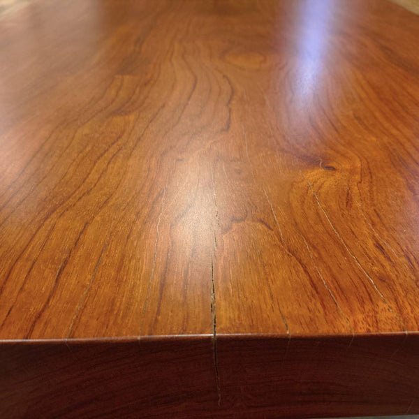 樹脂膜が水や汚れから木を保護してくれますので、日頃のお手入れは乾拭きや水拭きのみで済み、非常に楽にお使いいただける点が特徴です。特に飲食が主な用途になるダイニングテーブルでは、その効果を特に発揮します。