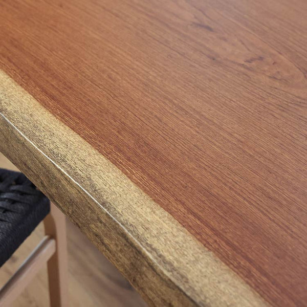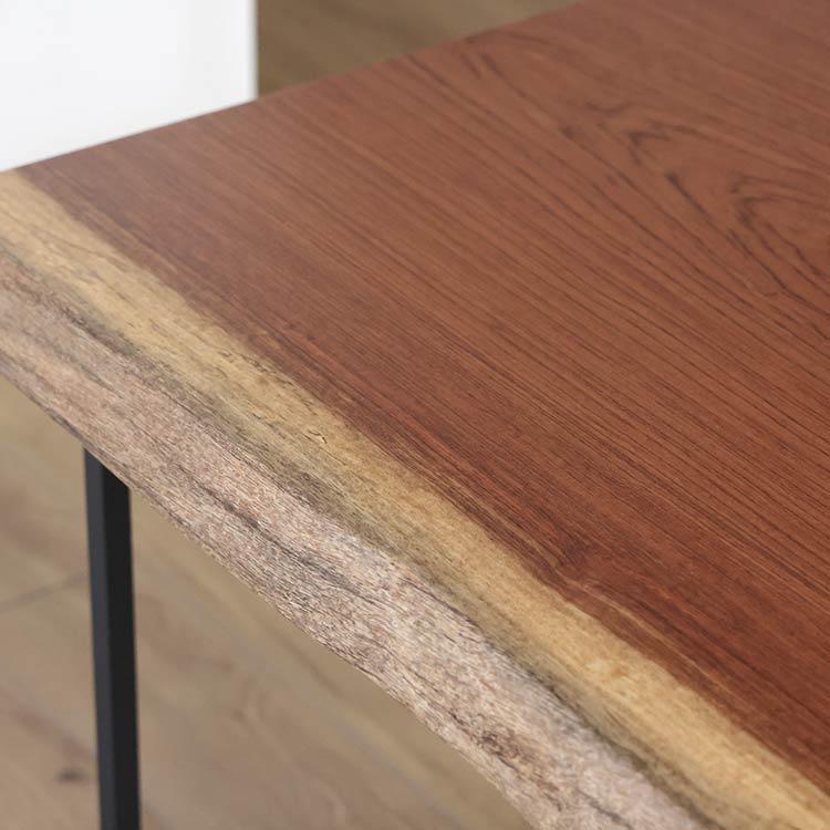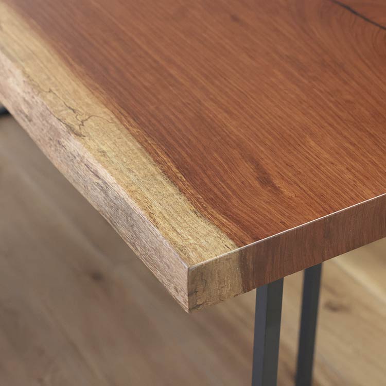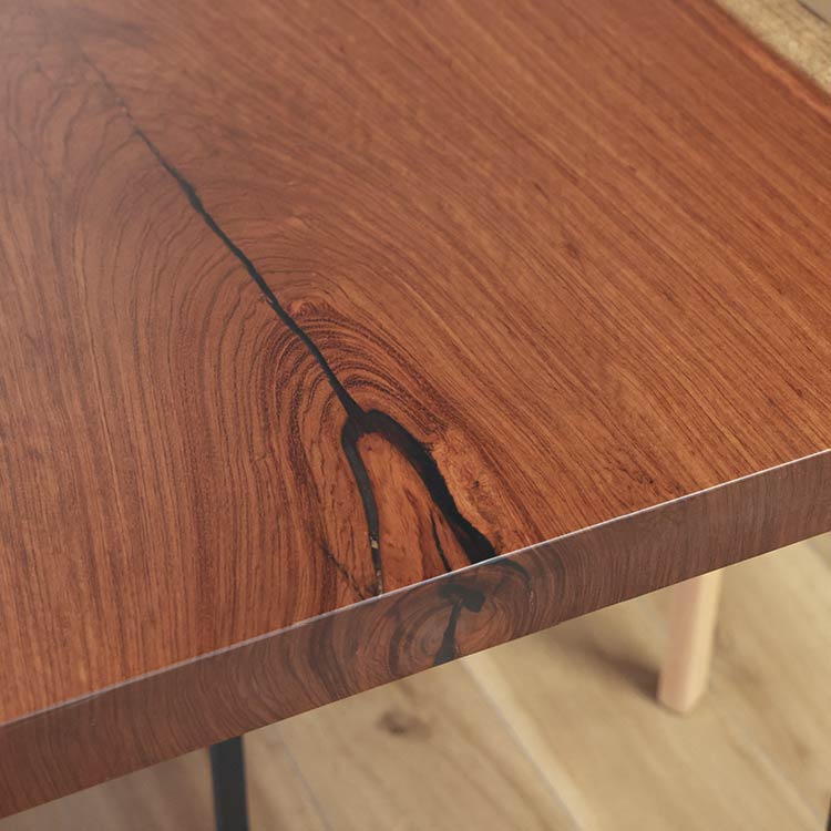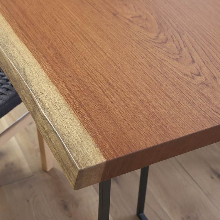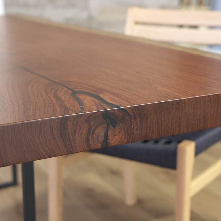 樹脂膜が水や汚れから木を保護してくれますので、日頃のお手入れは乾拭きや水拭きのみで済み、非常に楽にお使いいただける点が特徴です。特に飲食が主な用途になるダイニングテーブルでは、その効果を特に発揮します。