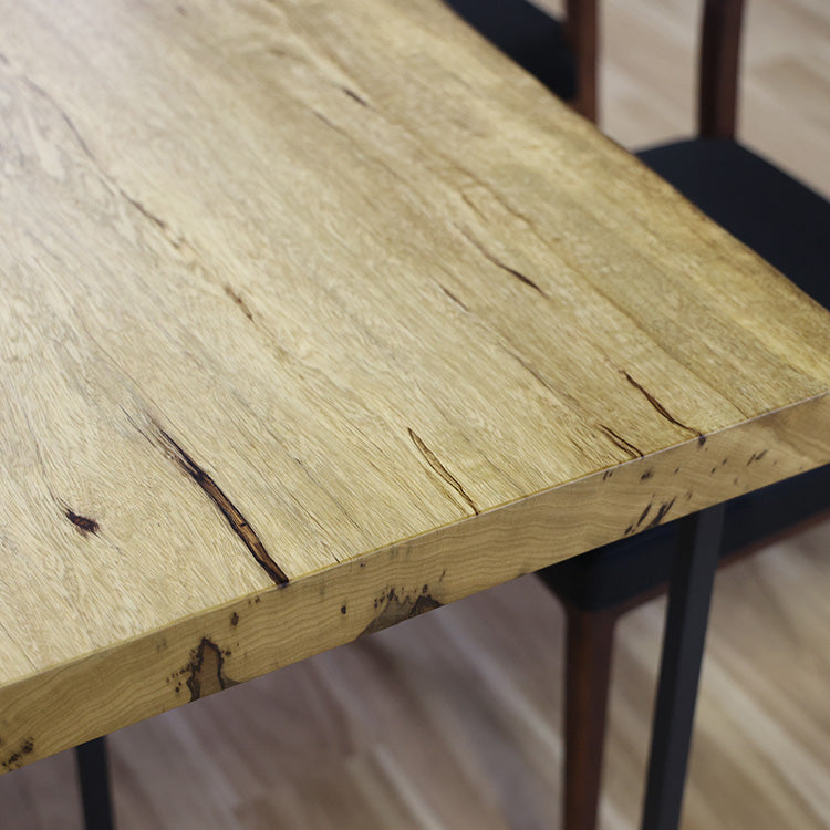 樹脂膜が水や汚れから木を保護してくれますので、日頃のお手入れは乾拭きや水拭きのみで済み、非常に楽にお使いいただける点が特徴です。特に飲食が主な用途になるダイニングテーブルでは、その効果を特に発揮します。