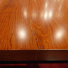 樹脂膜が水や汚れから木を保護してくれますので、日頃のお手入れは乾拭きや水拭きのみで済み、非常に楽にお使いいただける点が特徴です。特に飲食が主な用途になるダイニングテーブルでは、その効果を特に発揮します。