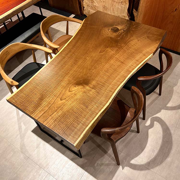 木には人と同じように個性があります。樹種や産地、樹齢はもちろん、同じ丸太から製材した一枚板でも同じものはひとつとしてありません。同じ名前の木でも色の明るいもの、暗いもの、節があるもの、傷があるものなど様々です。それは木が長い年月を過ごしてきた証であり、木が持つ個性です。だからこそ一枚板は‘世界にひとつのモノ’になるのです。
