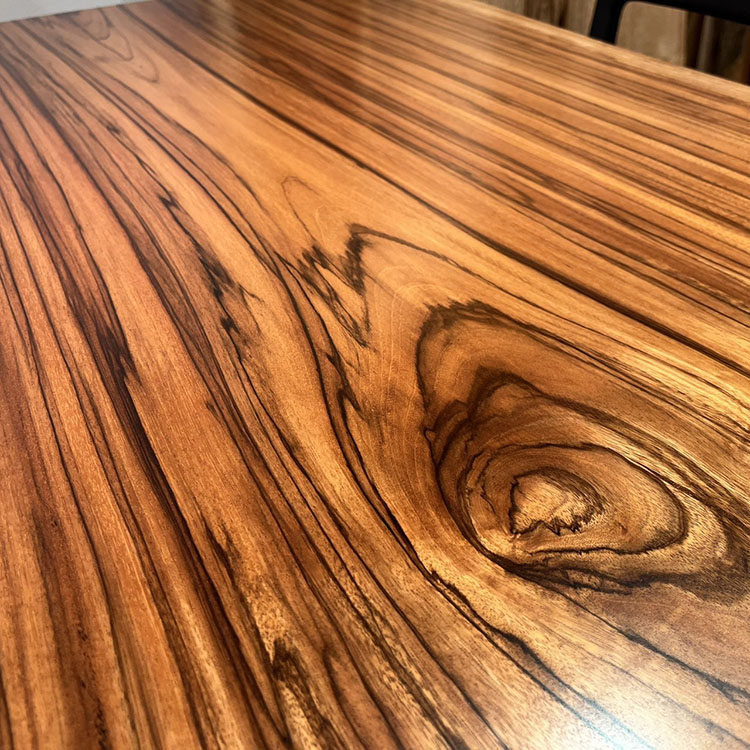 樹脂膜が水や汚れから木を保護してくれますので、日頃のお手入れは乾拭きや水拭きのみで済み、非常に楽にお使いいただける点が特徴です。特に飲食が主な用途になるダイニングテーブルでは、その効果を特に発揮します。
