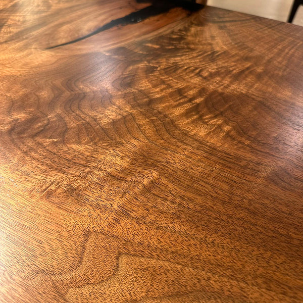 樹脂膜が水や汚れから木を保護してくれますので、日頃のお手入れは乾拭きや水拭きのみで済み、非常に楽にお使いいただける点が特徴です。特に飲食が主な用途になるダイニングテーブルでは、その効果を特に発揮します。
