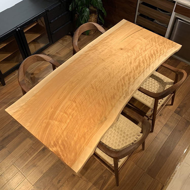 木には人と同じように個性があります。樹種や産地、樹齢はもちろん、同じ丸太から製材した一枚板でも同じものはひとつとしてありません。同じ名前の木でも色の明るいもの、暗いもの、節があるもの、傷があるものなど様々です。それは木が長い年月を過ごしてきた証であり、木が持つ個性です。だからこそ一枚板は‘世界にひとつのモノ’になるのです。