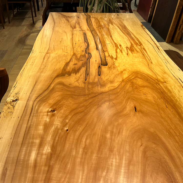 木には人と同じように個性があります。樹種や産地、樹齢はもちろん、同じ丸太から製材した一枚板でも同じものはひとつとしてありません。同じ名前の木でも色の明るいもの、暗いもの、節があるもの、傷があるものなど様々です。それは木が長い年月を過ごしてきた証であり、木が持つ個性です。だからこそ一枚板は‘世界にひとつのモノ’になるのです。