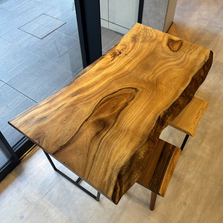 木には人と同じように個性があります。樹種や産地、樹齢はもちろん、同じ丸太から製材した一枚板でも同じものはひとつとしてありません。同じ名前の木でも色の明るいもの、暗いもの、節があるもの、傷があるものなど様々です。それは木が長い年月を過ごしてきた証であり、木が持つ個性です。だからこそ一枚板は‘世界にひとつのモノ’になるのです。