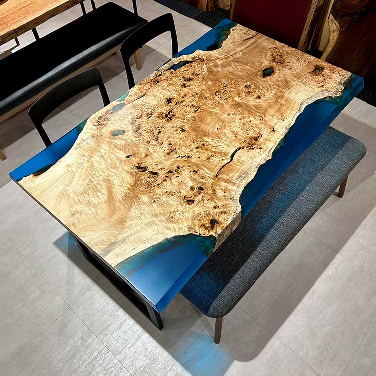 樹脂膜が水や汚れから木を保護してくれますので、日頃のお手入れは乾拭きや水拭きのみで済み、非常に楽にお使いいただける点が特徴です。特に飲食が主な用途になるダイニングテーブルでは、その効果を特に発揮します。