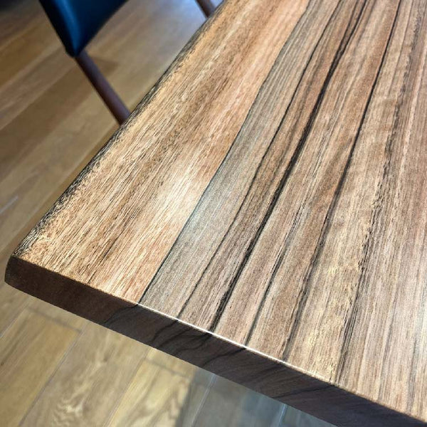 樹脂膜が水や汚れから木を保護してくれますので、日頃のお手入れは乾拭きや水拭きのみで済み、非常に楽にお使いいただける点が特徴です。特に飲食が主な用途になるダイニングテーブルでは、その効果を特に発揮します。