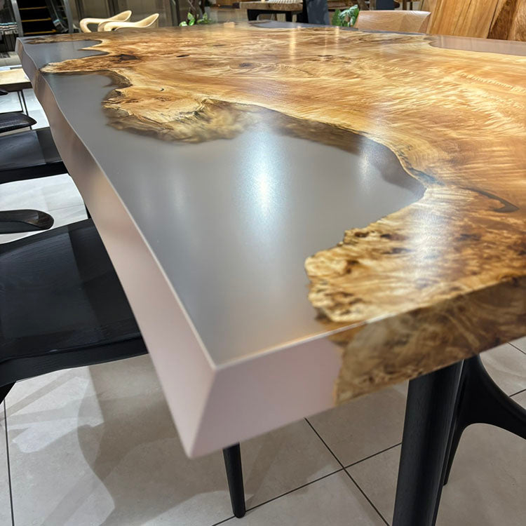 樹脂膜が水や汚れから木を保護してくれますので、日頃のお手入れは乾拭きや水拭きのみで済み、非常に楽にお使いいただける点が特徴です。特に飲食が主な用途になるダイニングテーブルでは、その効果を特に発揮します。