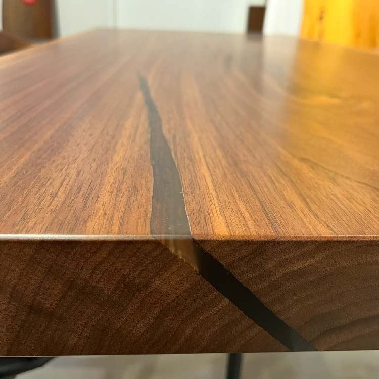 樹脂膜が水や汚れから木を保護してくれますので、日頃のお手入れは乾拭きや水拭きのみで済み、非常に楽にお使いいただける点が特徴です。特に飲食が主な用途になるダイニングテーブルでは、その効果を特に発揮します。