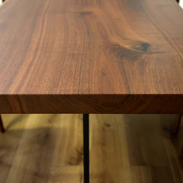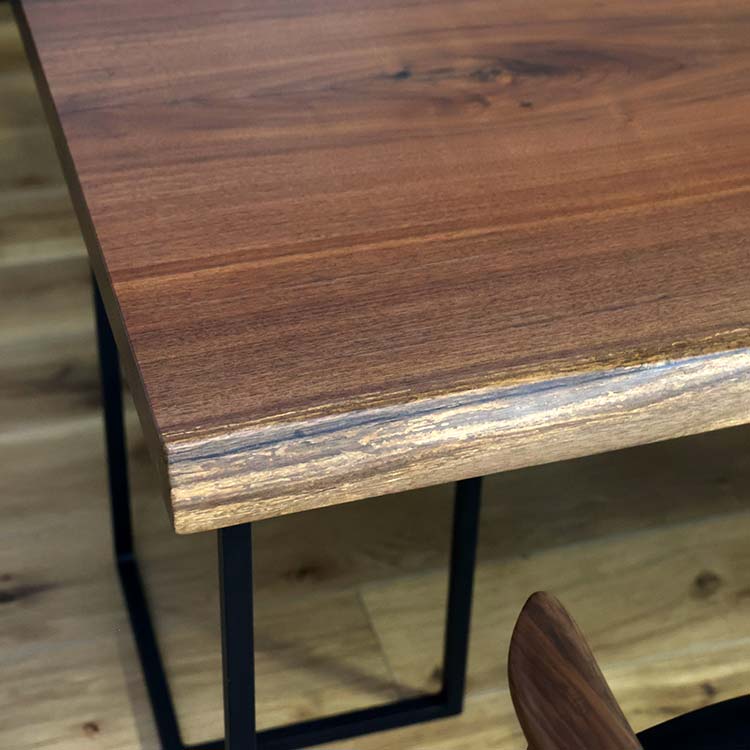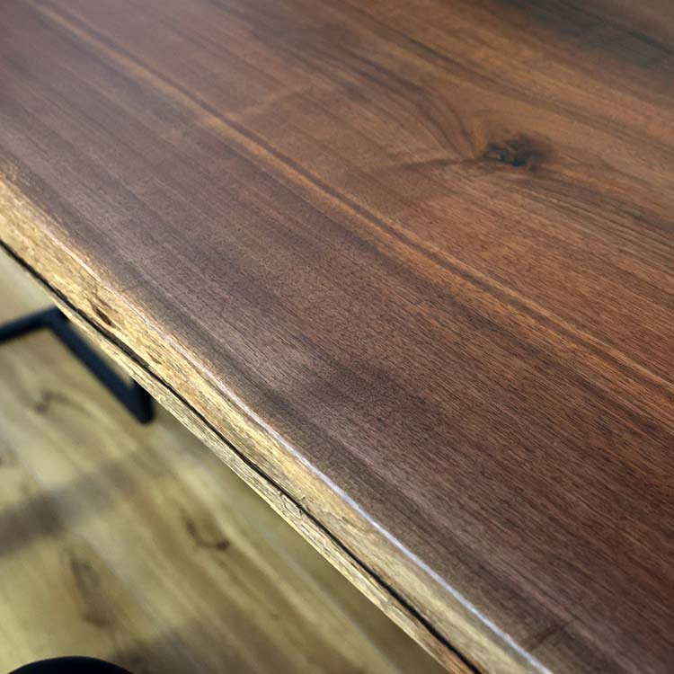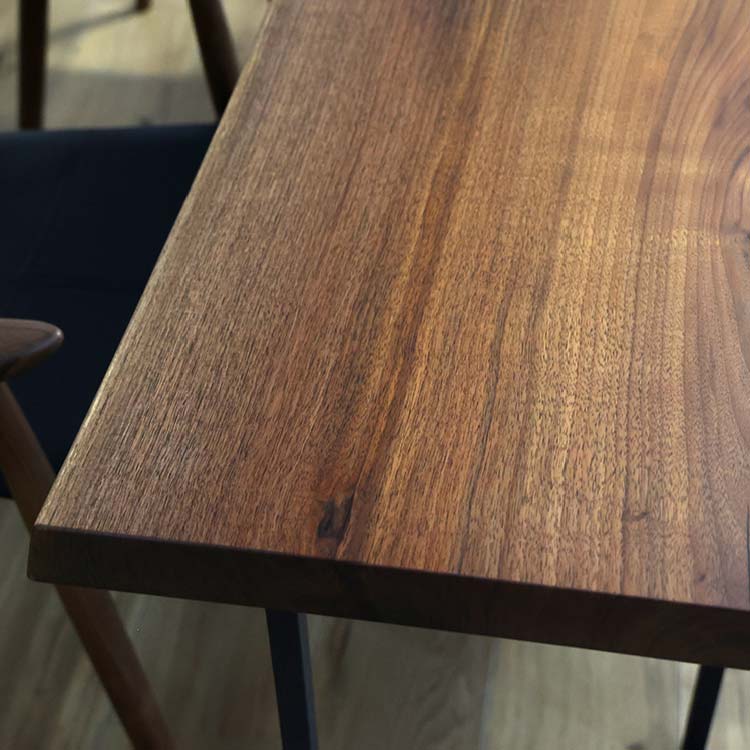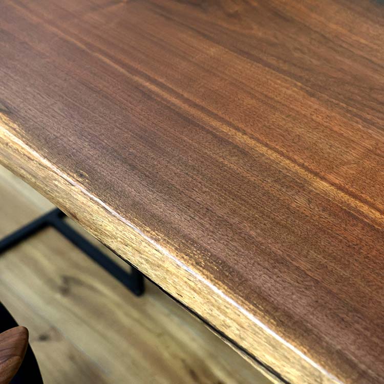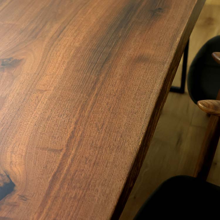 樹脂膜が水や汚れから木を保護してくれますので、日頃のお手入れは乾拭きや水拭きのみで済み、非常に楽にお使いいただける点が特徴です。特に飲食が主な用途になるダイニングテーブルでは、その効果を特に発揮します。