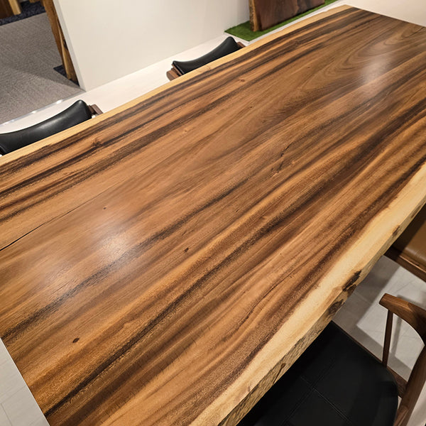木には人と同じように個性があります。樹種や産地、樹齢はもちろん、同じ丸太から製材した一枚板でも同じものはひとつとしてありません。同じ名前の木でも色の明るいもの、暗いもの、節があるもの、傷があるものなど様々です。それは木が長い年月を過ごしてきた証であり、木が持つ個性です。だからこそ一枚板は‘世界にひとつのモノ’になるのです。