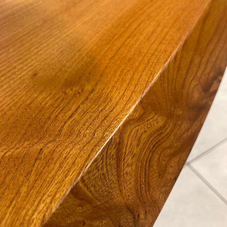 樹脂膜が水や汚れから木を保護してくれますので、日頃のお手入れは乾拭きや水拭きのみで済み、非常に楽にお使いいただける点が特徴です。特に飲食が主な用途になるダイニングテーブルでは、その効果を特に発揮します。