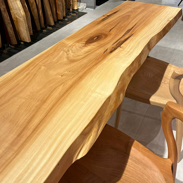 木には人と同じように個性があります。樹種や産地、樹齢はもちろん、同じ丸太から製材した一枚板でも同じものはひとつとしてありません。同じ名前の木でも色の明るいもの、暗いもの、節があるもの、傷があるものなど様々です。それは木が長い年月を過ごしてきた証であり、木が持つ個性です。だからこそ一枚板は‘世界にひとつのモノ’になるのです。