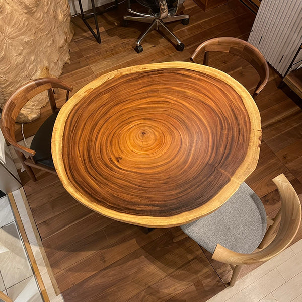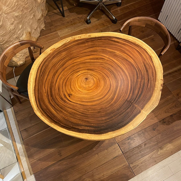 木には人と同じように個性があります。樹種や産地、樹齢はもちろん、同じ丸太から製材した一枚板でも同じものはひとつとしてありません。同じ名前の木でも色の明るいもの、暗いもの、節があるもの、傷があるものなど様々です。それは木が長い年月を過ごしてきた証であり、木が持つ個性です。だからこそ一枚板は‘世界にひとつのモノ’になるのです。