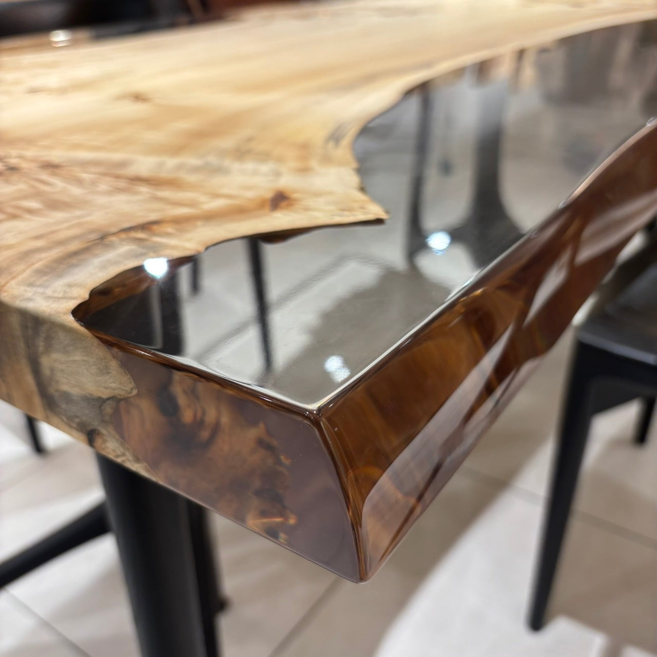 樹脂膜が水や汚れから木を保護してくれますので、日頃のお手入れは乾拭きや水拭きのみで済み、非常に楽にお使いいただける点が特徴です。特に飲食が主な用途になるダイニングテーブルでは、その効果を特に発揮します。