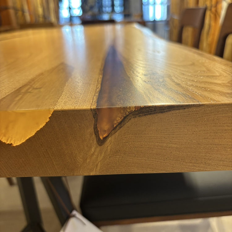樹脂膜が水や汚れから木を保護してくれますので、日頃のお手入れは乾拭きや水拭きのみで済み、非常に楽にお使いいただける点が特徴です。特に飲食が主な用途になるダイニングテーブルでは、その効果を特に発揮します。