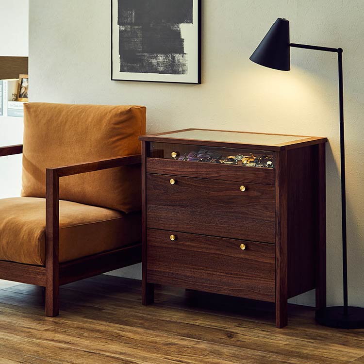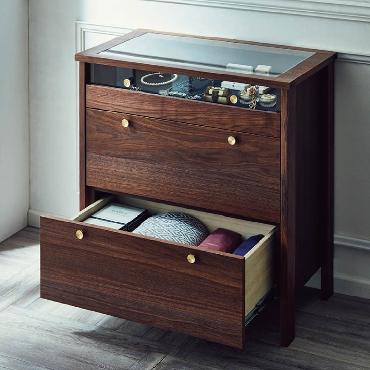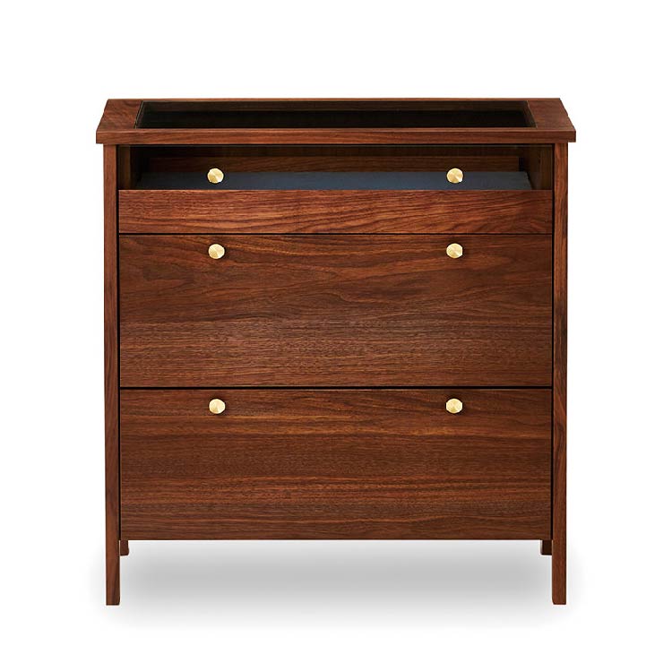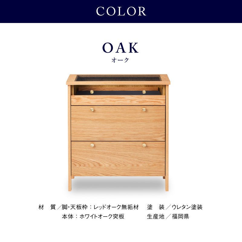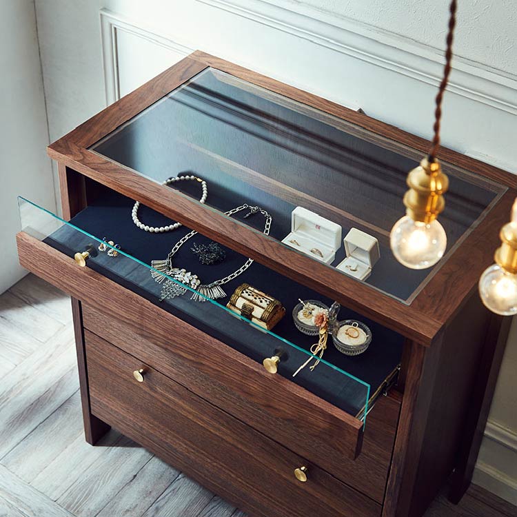 商品情報 | 真鍮取っ手を用いた可愛らしいリビングチェストシリーズ ガラス天板を用いたコレクションボードタイプと通常のチェストの2種類あります。 |