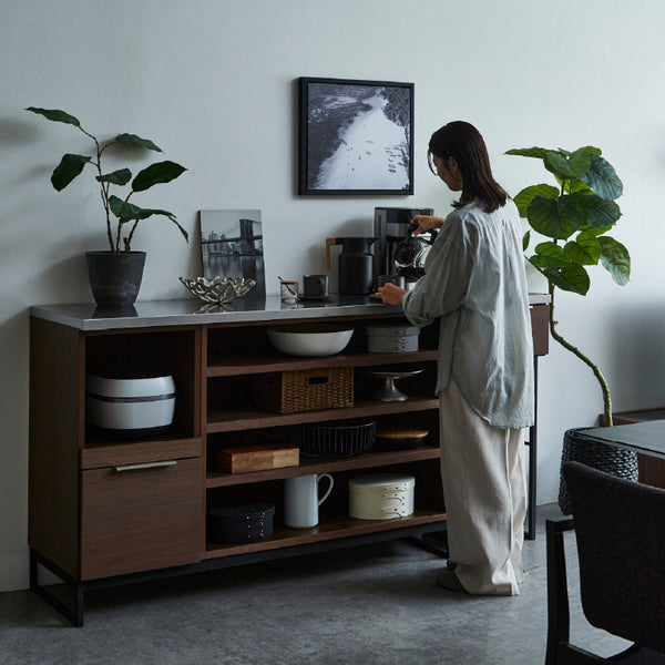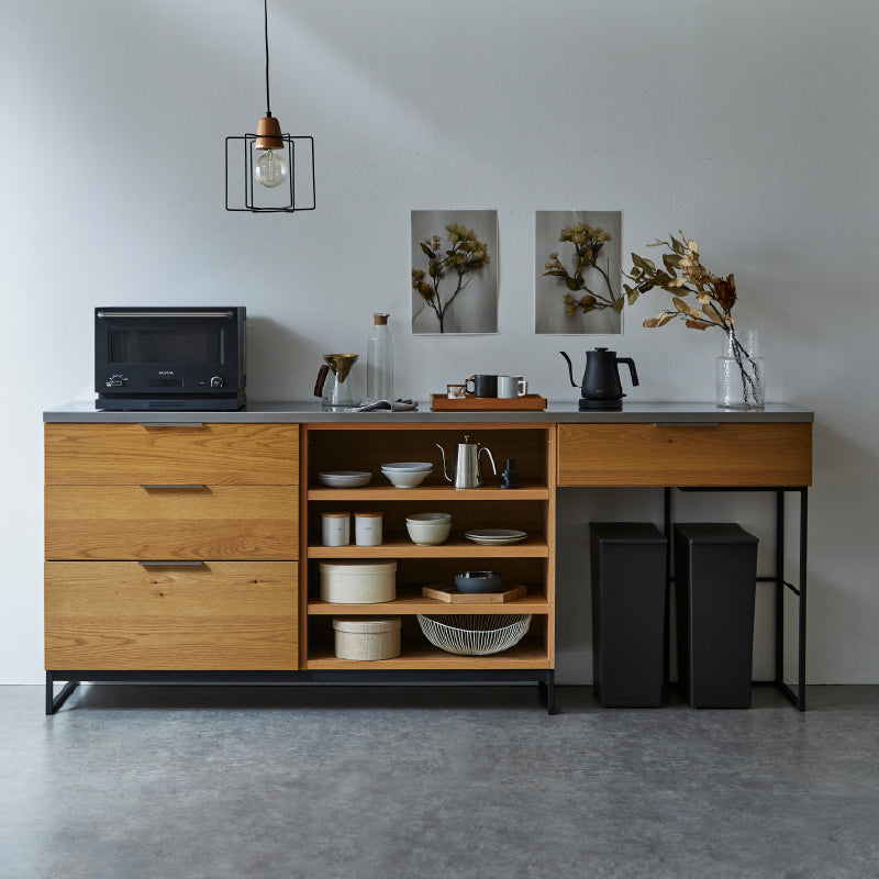 | 商品情報 | 対面型システムキッチンにあわせるイメージで設計しています。サイズ展開も160~240センチと幅広い展開とし、さまざまな用途に対応可能です。本体はウォールナットとホワイトオーク、脚タイプは、台輪式とスチール脚からセレクト可能です。本体はスライドカウンター、オープンシェルフ、引出、ダストと4つのタイプから組み合わせ可能です。 |