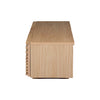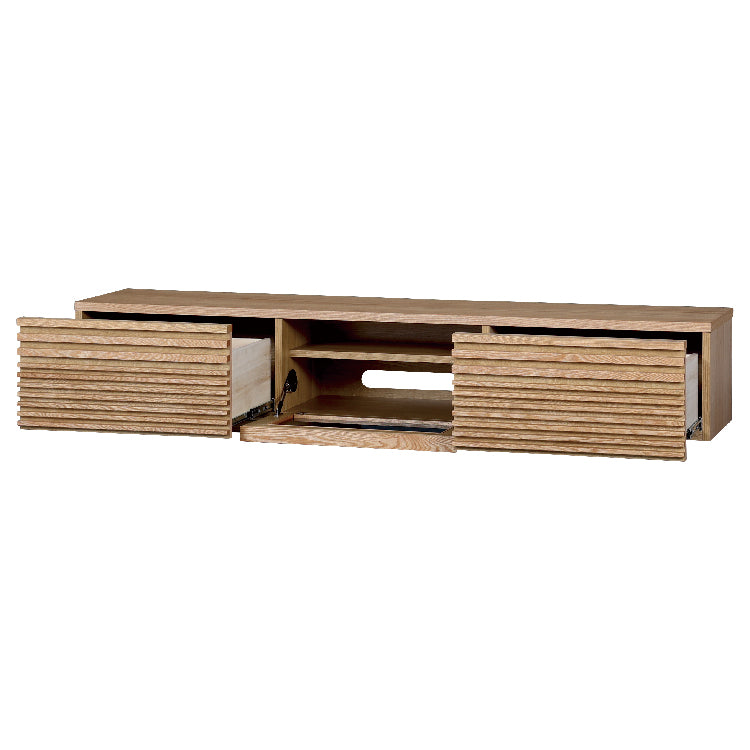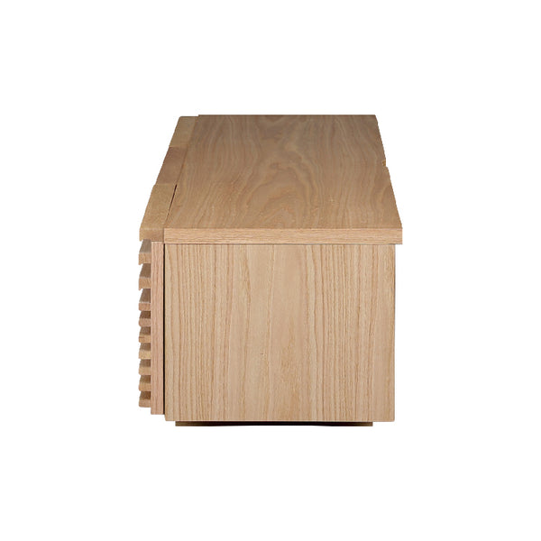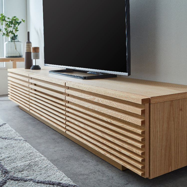 | 商品情報 | 前板には専用に設計された無垢のルーバーをもちいています。手を掛ける部分には少し太めにしたうえで削り込みを行い扉の開閉を行いやすくしています。下部は、高級感をだすため、可能な限り細いルーバーを設けています。両側は引き出し、真ん中はフラップ扉の仕様です。 |