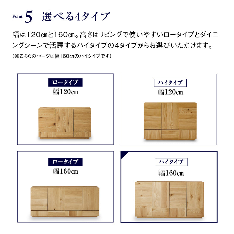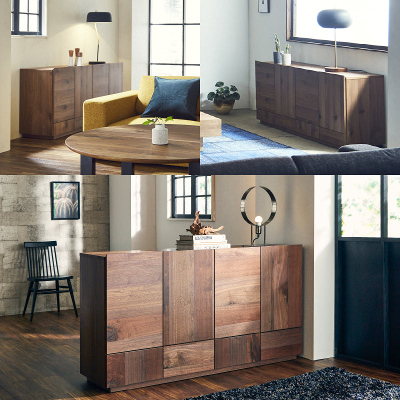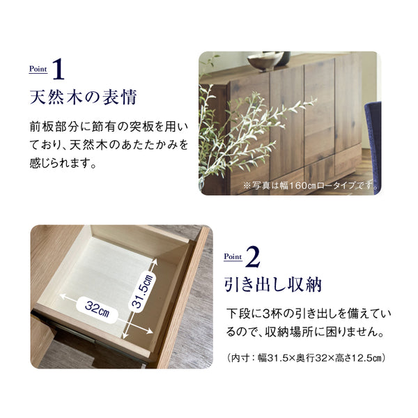 | 商品情報 | 節有りの突板を使用したサイドボード。使うスタイルにあわせて高さが選べます。 |