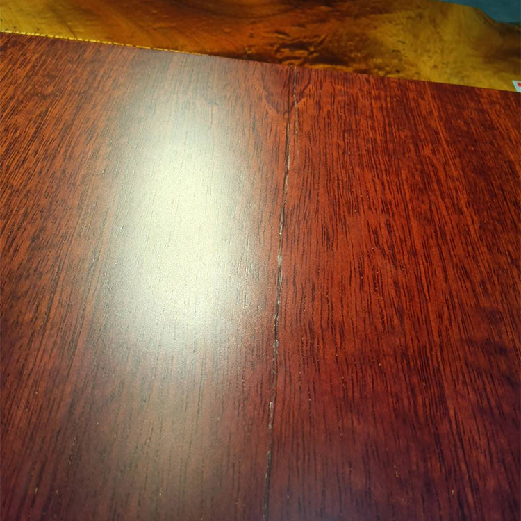 樹脂膜が水や汚れから木を保護してくれますので、日頃のお手入れは乾拭きや水拭きのみで済み、非常に楽にお使いいただける点が特徴です。特に飲食が主な用途になるダイニングテーブルでは、その効果を特に発揮します。