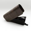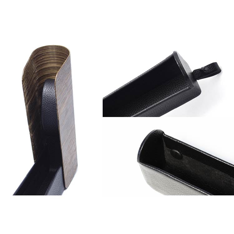 曲げ木のホールド力に負けない絶妙な強度に調整された革ケースは新潟県長岡市にアトリエを構える革作家の手によるもの。