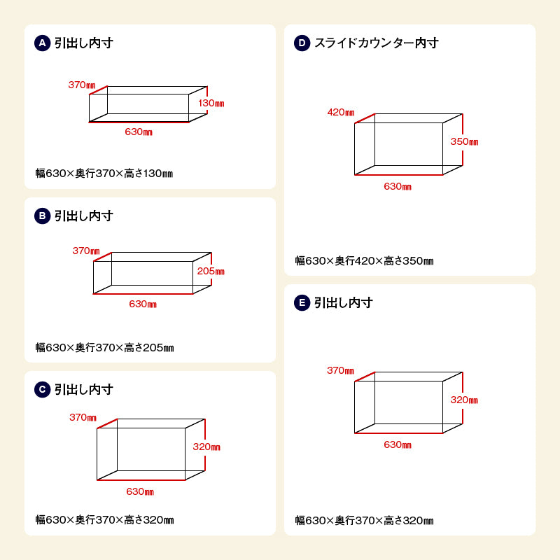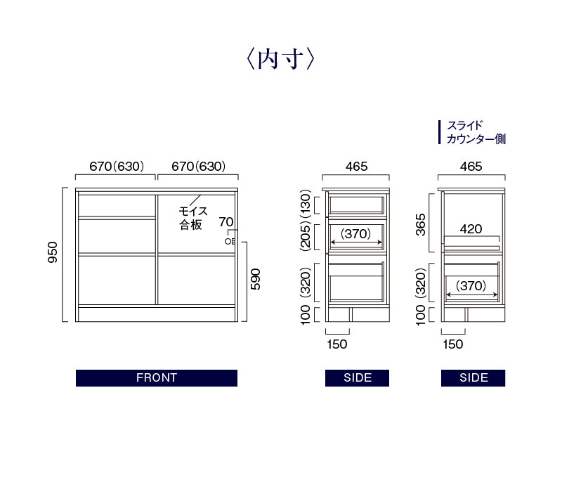 | 耐荷重 | カウンター40kg、スライドカウンター15kg、引出25kg |