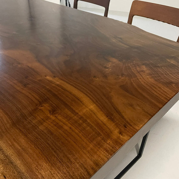 樹脂膜が水や汚れから木を保護してくれますので、日頃のお手入れは乾拭きや水拭きのみで済み、非常に楽にお使いいただける点が特徴です。特に飲食が主な用途になるダイニングテーブルでは、その効果を特に発揮します。