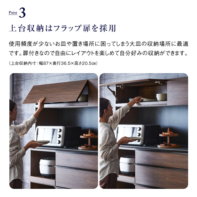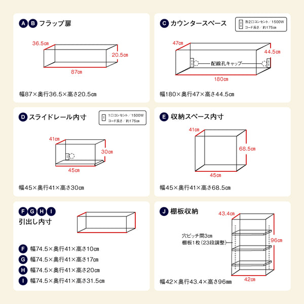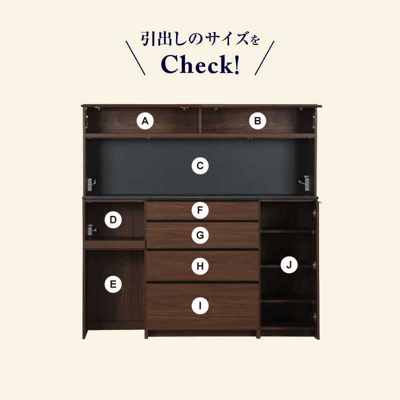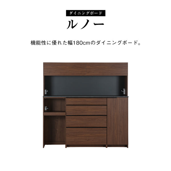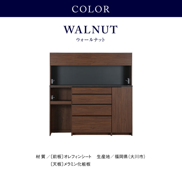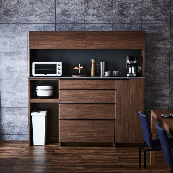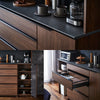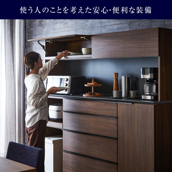 商品情報 | 日本の住宅企画にもっともマッチした180センチ幅で設計しています。ダスト収納、全ての引き出しに高ランクのソフトクローズレールを装備しています。カウンター天板には石目調のメラミン化粧板を採用しモダンなカットを施しています。ハイカウンターのため、家電の取り扱いもしやすいです。 |