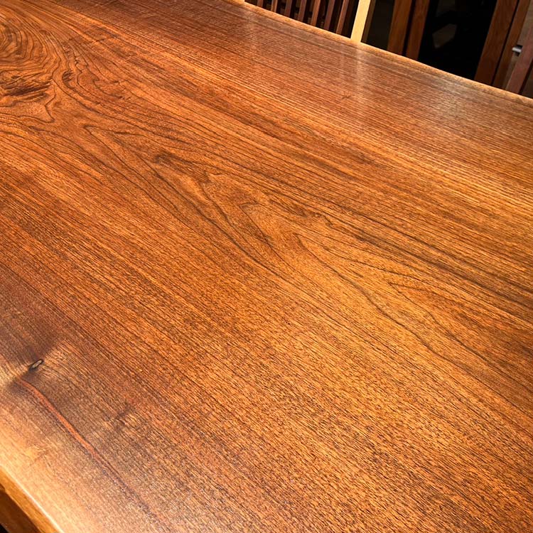樹脂膜が水や汚れから木を保護してくれますので、日頃のお手入れは乾拭きや水拭きのみで済み、非常に楽にお使いいただける点が特徴です。特に飲食が主な用途になるダイニングテーブルでは、その効果を特に発揮します。