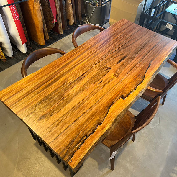 木には人と同じように個性があります。樹種や産地、樹齢はもちろん、同じ丸太から製材した一枚板でも同じものはひとつとしてありません。同じ名前の木でも色の明るいもの、暗いもの、節があるもの、傷があるものなど様々です。それは木が長い年月を過ごしてきた証であり、木が持つ個性です。だからこそ一枚板は‘世界にひとつのモノ’になるのです。