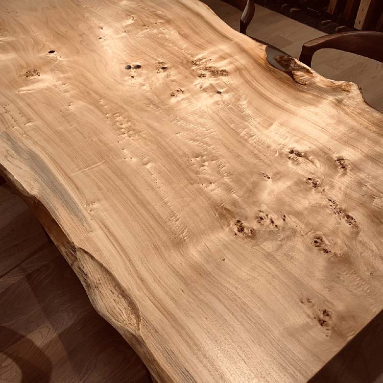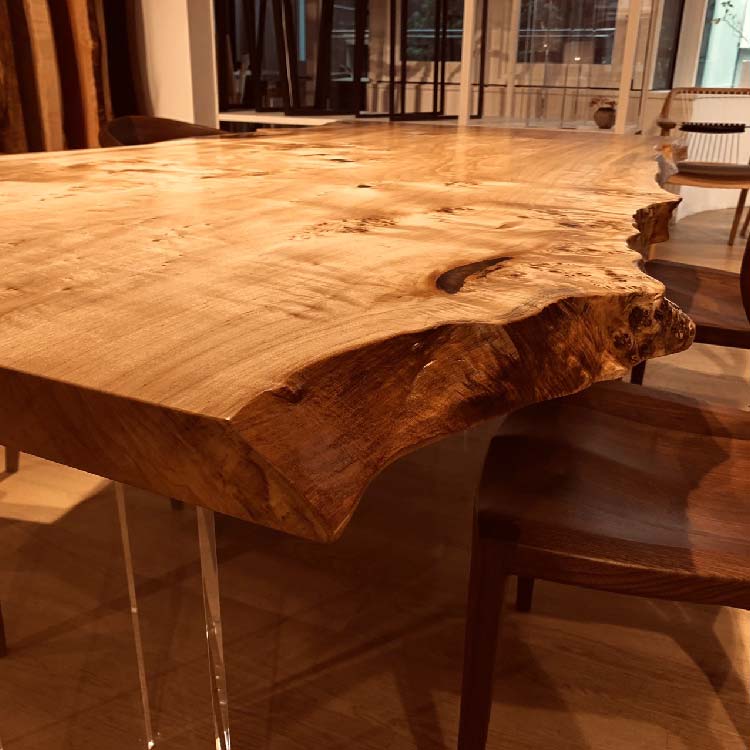 木には人と同じように個性があります。樹種や産地、樹齢はもちろん、同じ丸太から製材した一枚板でも同じものはひとつとしてありません。同じ名前の木でも色の明るいもの、暗いもの、節があるもの、傷があるものなど様々です。それは木が長い年月を過ごしてきた証であり、木が持つ個性です。だからこそ一枚板は‘世界にひとつのモノ’になるのです。