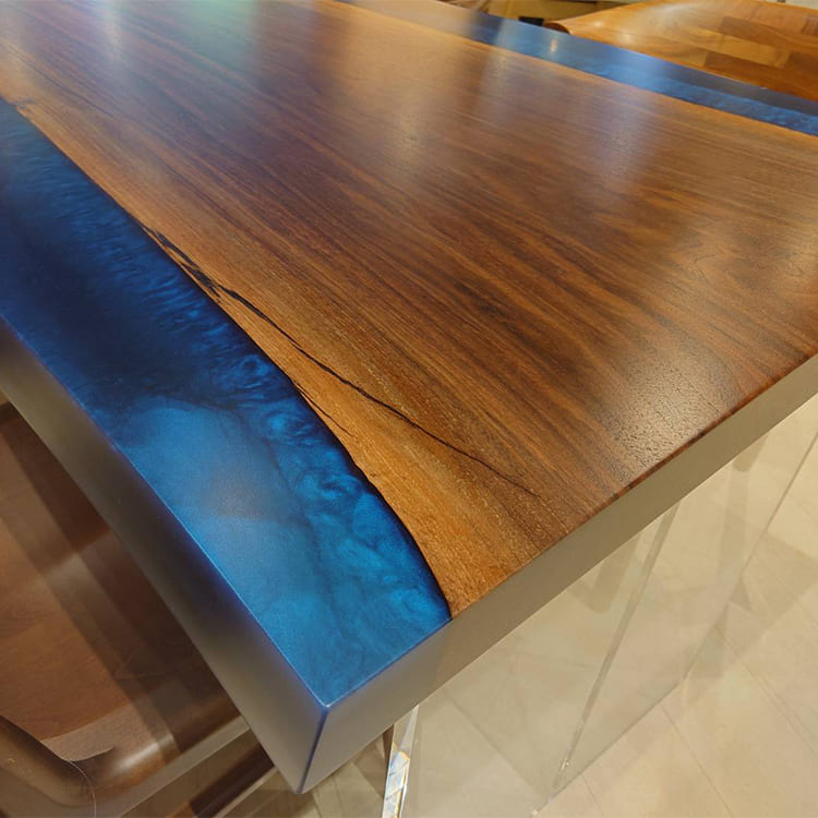 樹脂膜が水や汚れから木を保護してくれますので、日頃のお手入れは乾拭きや水拭きのみで済み、非常に楽にお使いいただける点が特徴です。特に飲食が主な用途になるダイニングテーブルでは、その効果を特に発揮します。
