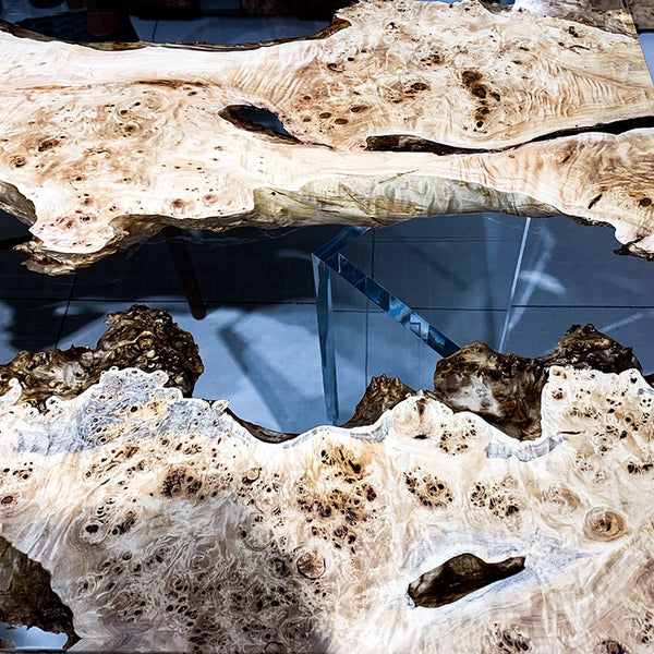 木には人と同じように個性があります。樹種や産地、樹齢はもちろん、同じ丸太から製材した一枚板でも同じものはひとつとしてありません。同じ名前の木でも色の明るいもの、暗いもの、節があるもの、傷があるものなど様々です。それは木が長い年月を過ごしてきた証であり、木が持つ個性です。だからこそ一枚板は‘世界にひとつのモノ’になるのです。